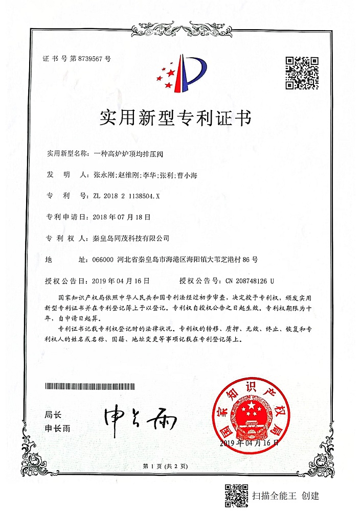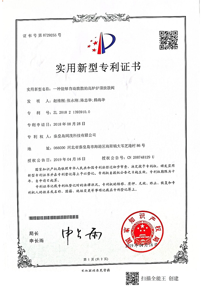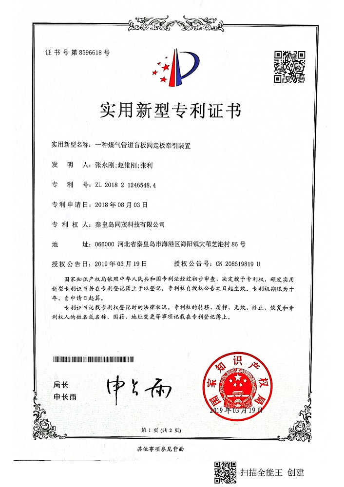 秦皇島同茂科技實(shí)用新型專利證書